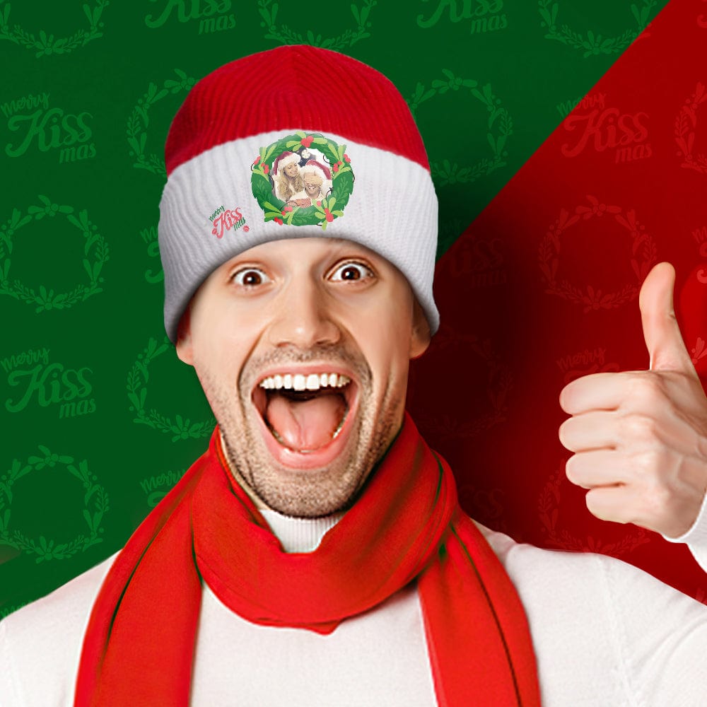 Custom Photo Christmas Beanie – Unisex Winter Warm Knitted Hat (Kissing Under the Mistletoe)